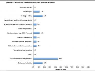 سنجد تفسير كوبنهاجن حاصل على 4 % وتفسير بوم حاصل على 17% طبعا النسبة الاكبر فضلوا عدم اختيار اي تفسير مطروح ونسبة 17% فضلوا الجانب العلمي كما هو موضح بالصورة التالية12 :